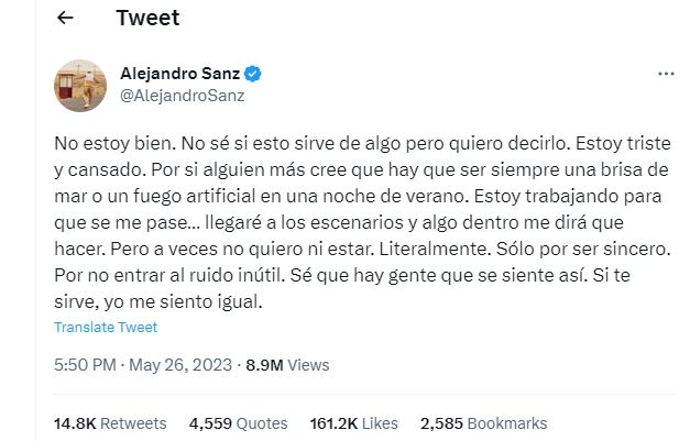 "No estoy bien. No sé si esto sirve de algo pero quiero decirlo. Estoy triste y cansado", así da inicio el inquietante mensaje que compartió Alejandro Sanz, a través de su cuenta oficial de Twitter, que pone a pensar a sus fanáticos en un pronto retiro del cantautor.