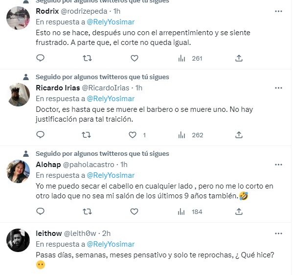 “Lo eres, tú muy mal”, “Doctor, es hasta que se muere el barbero o se muere uno. No hay justificación para tal traición”, “Desde el 95 me corta el pelo la misma persona, solo una vez en ese lapso de tiempo me ha cortado otra persona y fue durante lo fuerte de la pandemia”, fueron algunos de los comentarios que recibió.