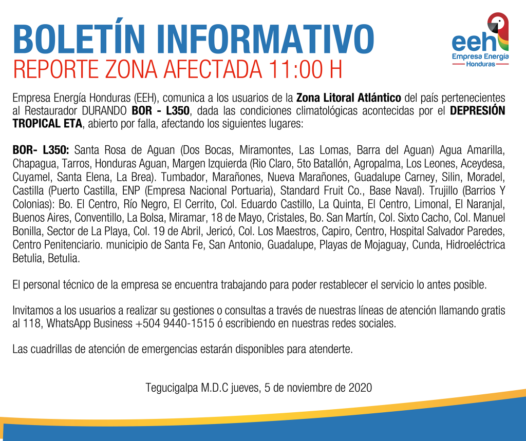 La Empresa de Energía de Honduras (EEH) informó que el jueves (5.11.2020) han habido varias zonas afectadas a causa de la depresión tropical Eta.